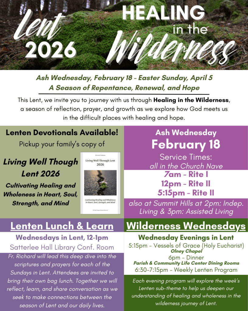 Wednesday, February 18 Lenten Lunch & Learn and Wilderness Wednesdays will begin February 25 and end on March 25. Nursery available (for children ages 4 and under) on Wednesday nights from 5-6pm and 6:30-7:30pm.