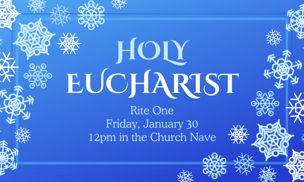We are excited, however, to offer a “pop-up” Holy Eucharist tomorrow, Friday, January 30 at Noon, in the church. This Rite One service will offer an opportunity to worship and fellowship before the weather arrives Friday night. Fr. Richard will preach, and we will read the lessons appointed for Sunday. We hope you will join us. Please enter through the front doors of the church or through Pendleton Hall.